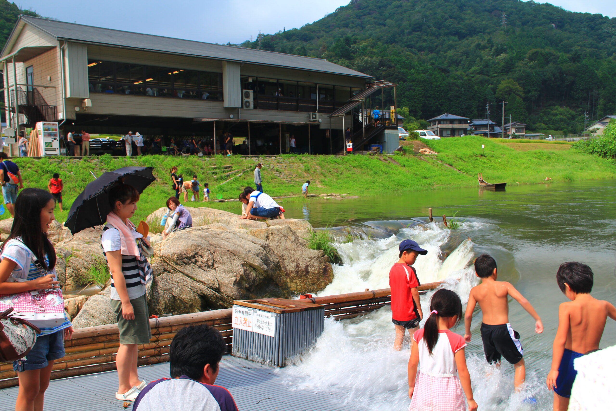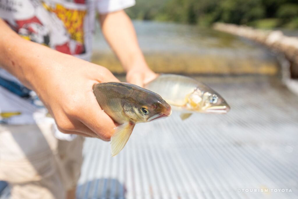 「川口やな」は、藤岡の豊かな自然に囲まれて、矢作川に入って鮎のつかみ取りができる人気スポットです。子どもから大人まで楽しむことができます。